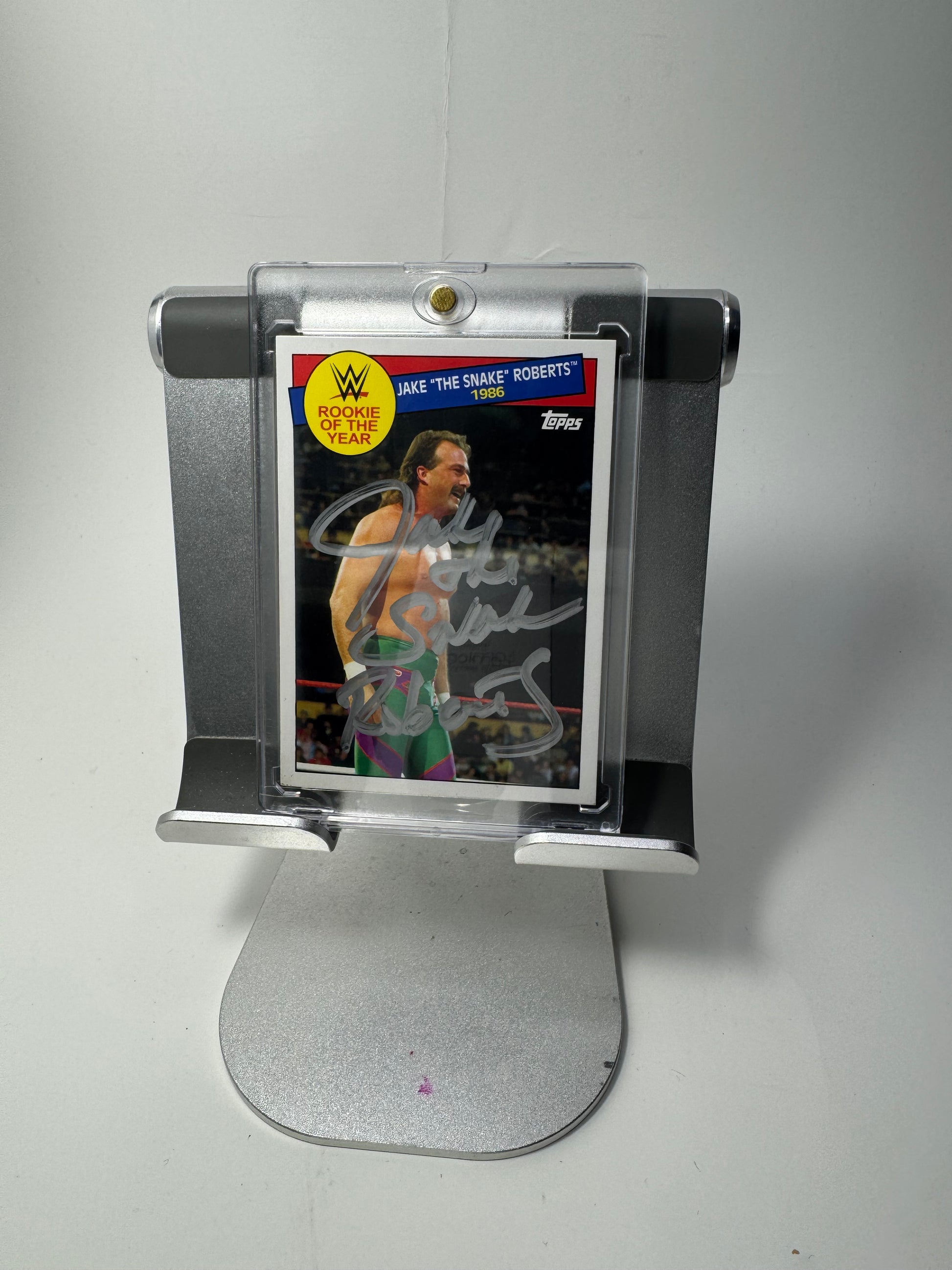 This exclusive collectible features the signature of WWE Hall of Famer Jake “The Snake” Roberts, making it a must-have for any wrestling fan. Recognized as the 1986 Rookie of the Year, Roberts captivated audiences with his cerebral mind games and the devastating DDT.