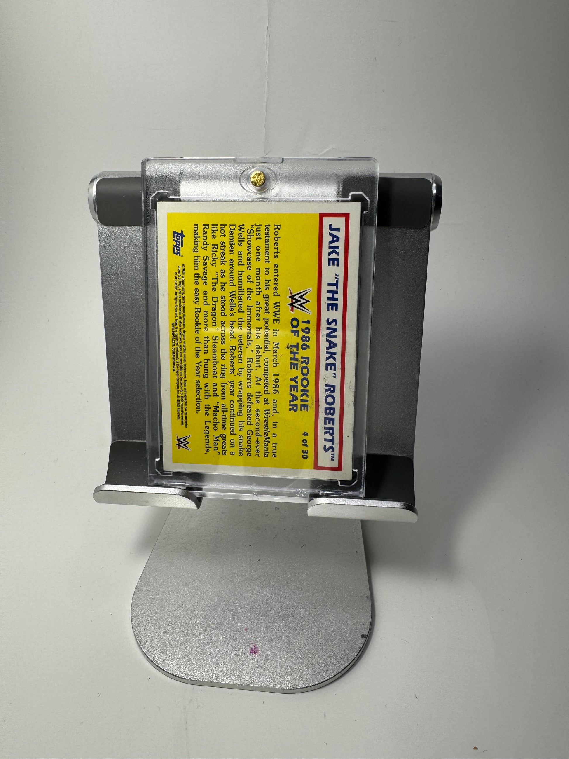 Step into the snake pit with the 2015 WWE Topps Heritage 1986 Rookie of the Year Jake “The Snake” Roberts Trading Card Signed by Jake Roberts!